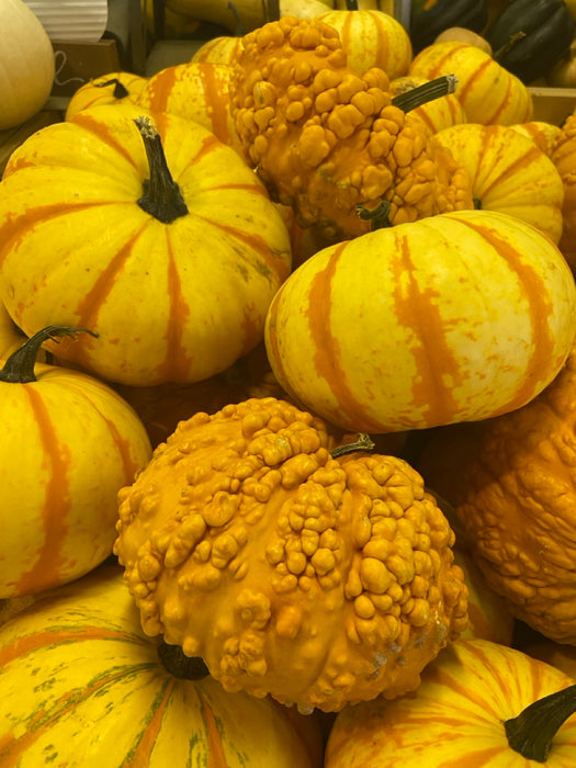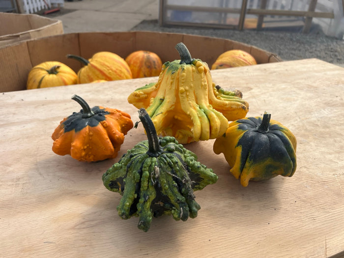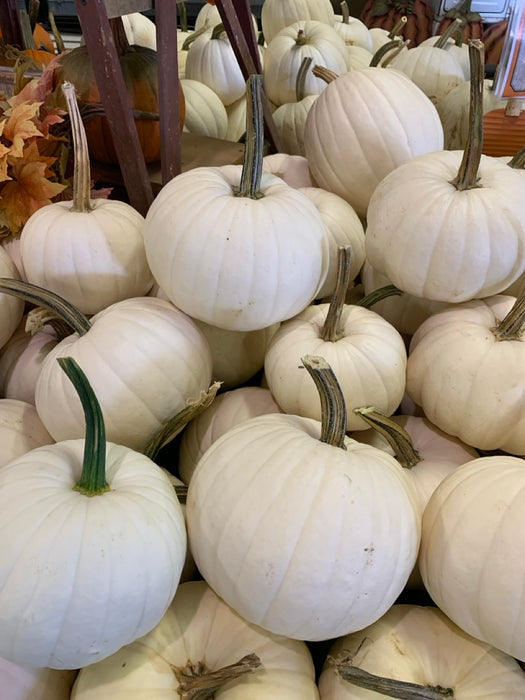 We have a wonderful selection of small pumpkins and gourds in our market along with pie pumpkins and white pumpkins for purchase.